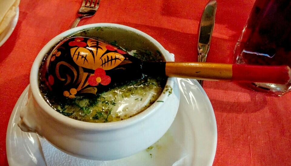 Вкусная клюковка, солянка в горшочках холодная и с непривычным запахом потрошков. Интерьер симпатичный, в ресторане просторно.